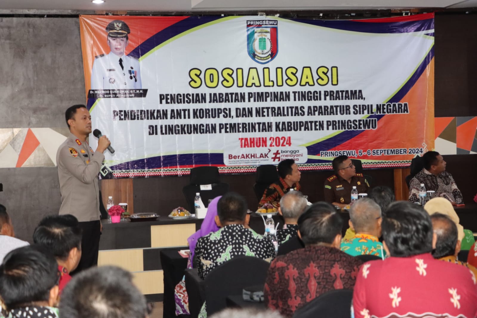 Hotnews.co.d, Pringsewu- Kapolres Pringsewu, AKBP M. Yunnus Saputra, mengingatkan Aparatur Sipil Negara (ASN) di lingkungan Pemerintah Kabupaten Pringsewu untuk menjauhi tindak pidana korupsi serta menjaga netralitas selama Pilkada 2024. Hal ini disampaikan saat AKBP Yunnus menjadi pembicara dalam acara sosialisasi pengisian jabatan Pratama, pendidikan antikorupsi, dan netralitas ASN di lingkungan Pemerintah Kabupaten Pringsewu, yang berlangsung di ballroom Hotel Regency, Gadingrejo, Kamis (5/9/2024).