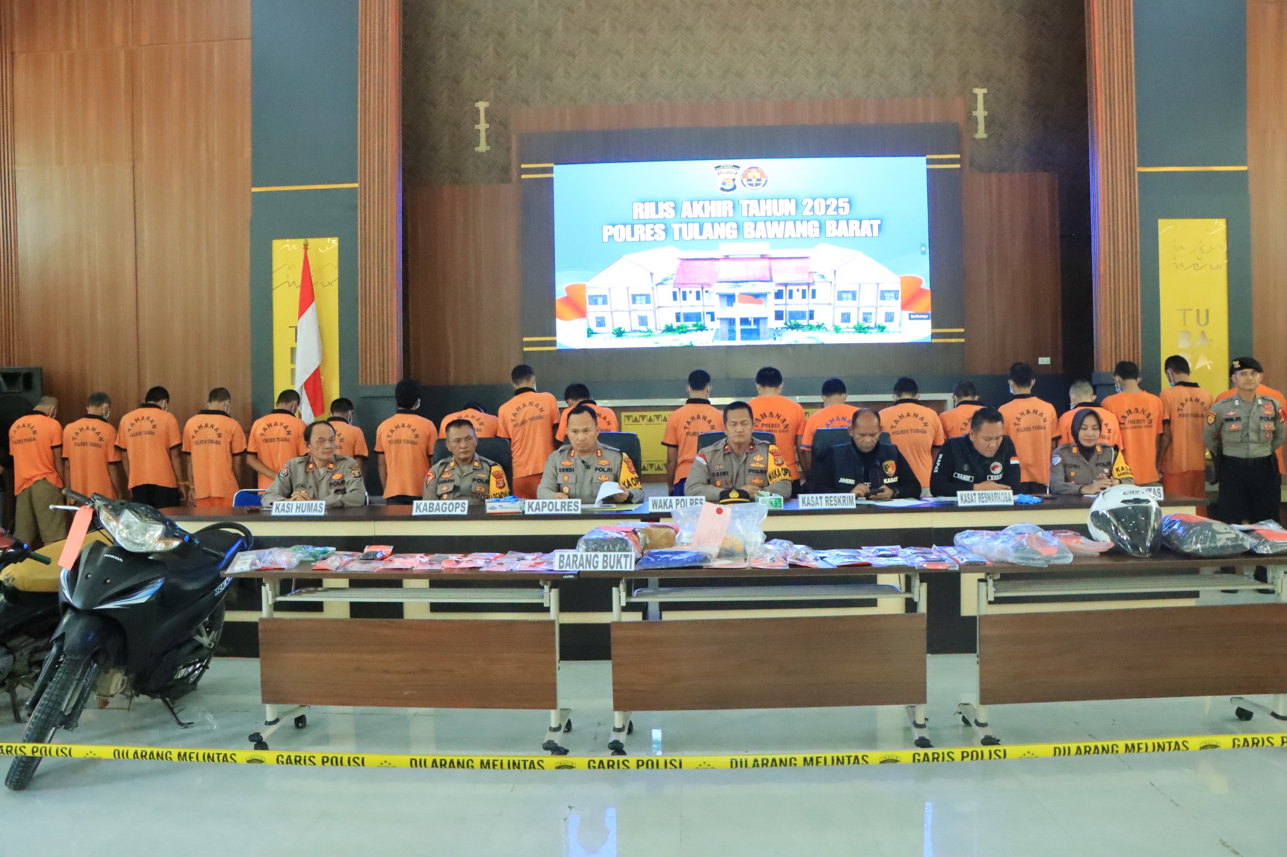 *Tulang Bawang Barat*—-Polres Tulang Bawang Barat Polda Lampung Menggelar Rilis Akhir Tahun 2025 yang disampaikan langsung oleh Kapolres Tulang Bawang Barat AKBP Sendi Antoni, S.I.K., M.IK. dengan didampingi oleh Waka Polres, Kabag Ops, Kasat Reskrim, Kasat Narkoba, Kasat Lantas, Kasat Tahti, Kasi Propam, Kasi humas dan Para Kapolsek Jajaran Polres Tubaba, bertempat di Aula Sarja Arya Racana Pores Tulang Bawang Barat, Rabu (31/12/2025).