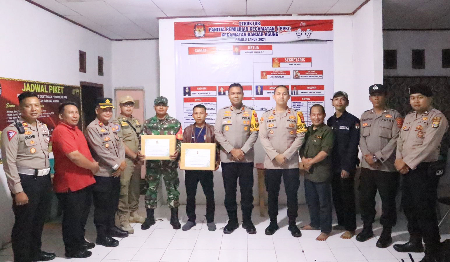 Lampung – Kapolres Tulang Bawang, Polda Lampung, AKBP James H Hutajulu, SIK, SH, MH, MIK bersama PJU Polres mengecek langsung kondisi dari personel yang terlibat langsung dalam pengamanan surat suara di PPK yang ada di wilayah hukumnya. Kamis (15/02/2024) sore.