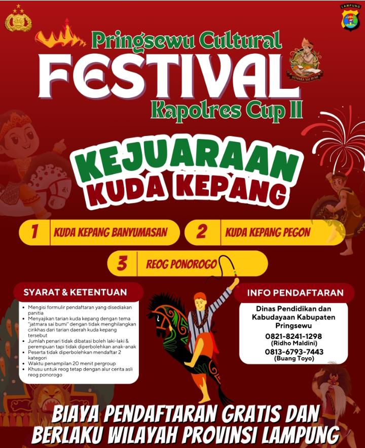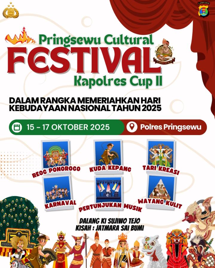 Hotnews.co.id Pringsewu – Polres Pringsewu bersama Pemerintah Kabupaten Pringsewu akan menggelar Pringsewu Cultural Festival (Kapolres Cup II), sebuah ajang seni dan budaya yang berlangsung selama tiga hari, mulai 15 hingga 17 Oktober 2025.