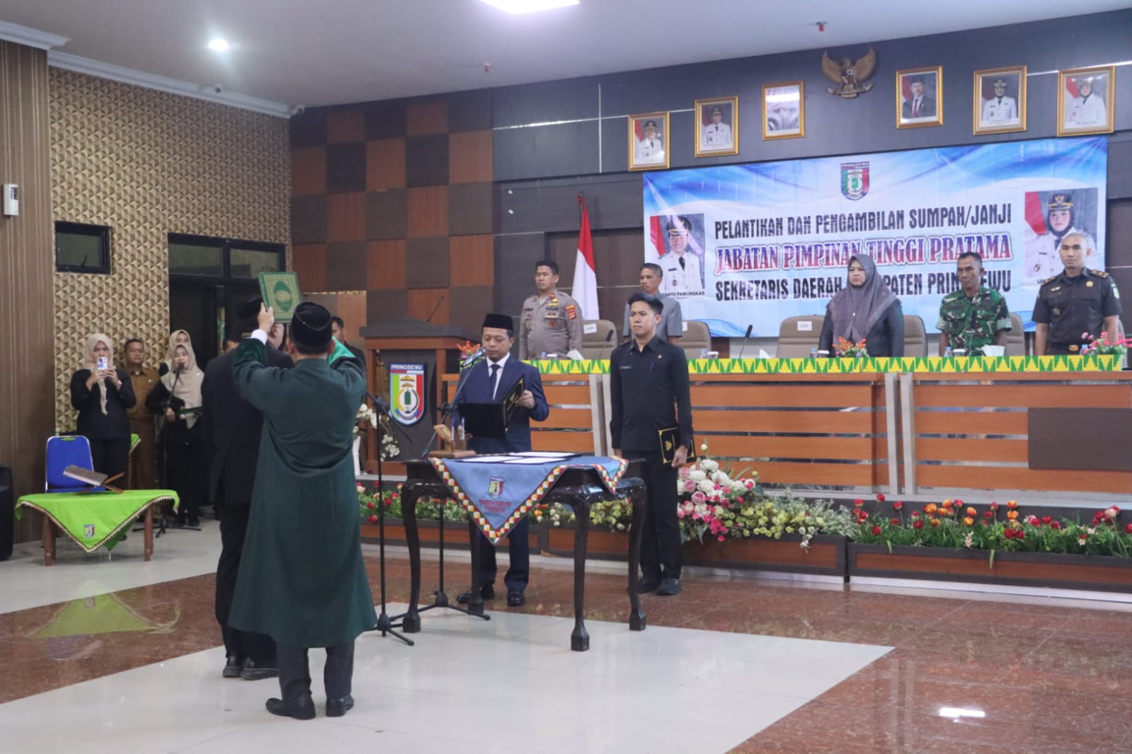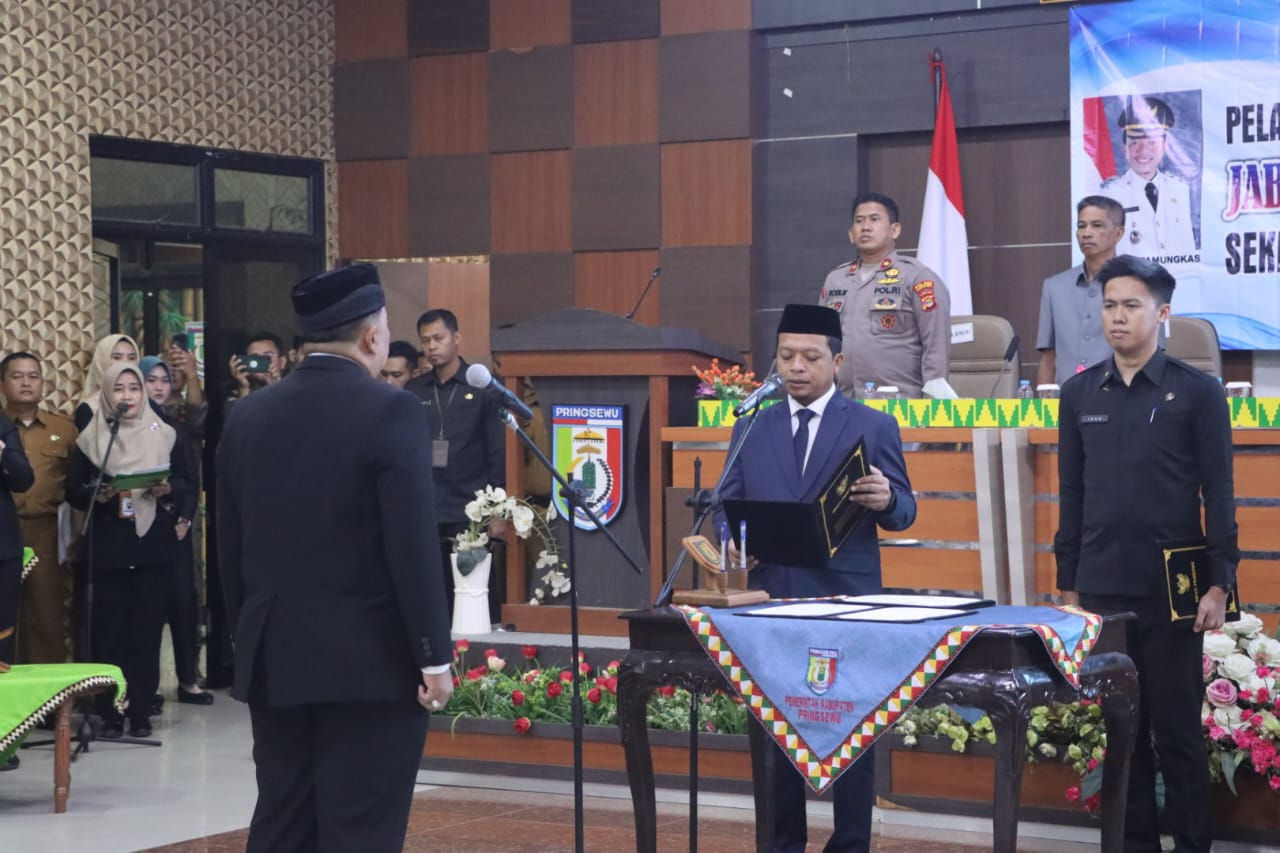 Prosesi pelantikan berlangsung khidmat di Aula Utama Bupati Pringsewu, dipimpin langsung oleh Bupati Pringsewu Riyanto Pamungkas. Hadir menyaksikan jajaran Forkopimda, di antaranya Ketua DPRD, Wakil Bupati Pringsewu, unsur kepolisian, TNI, kejaksaan, para kepala organisasi vertikal, serta pejabat di lingkungan Pemkab Pringsewu.