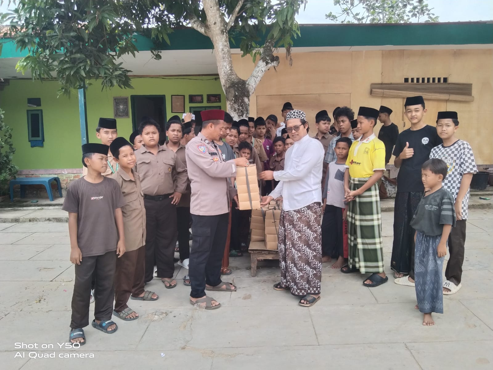 Dalam kegiatan tersebut, Kapolsek Banjar Agung, AKP Irwansyah, S.H., M.H., mewakili Kapolres Tulang Bawang bersama personel Polsek membagikan 50 paket nasi kotak kepada santriwan dan santriwati.
