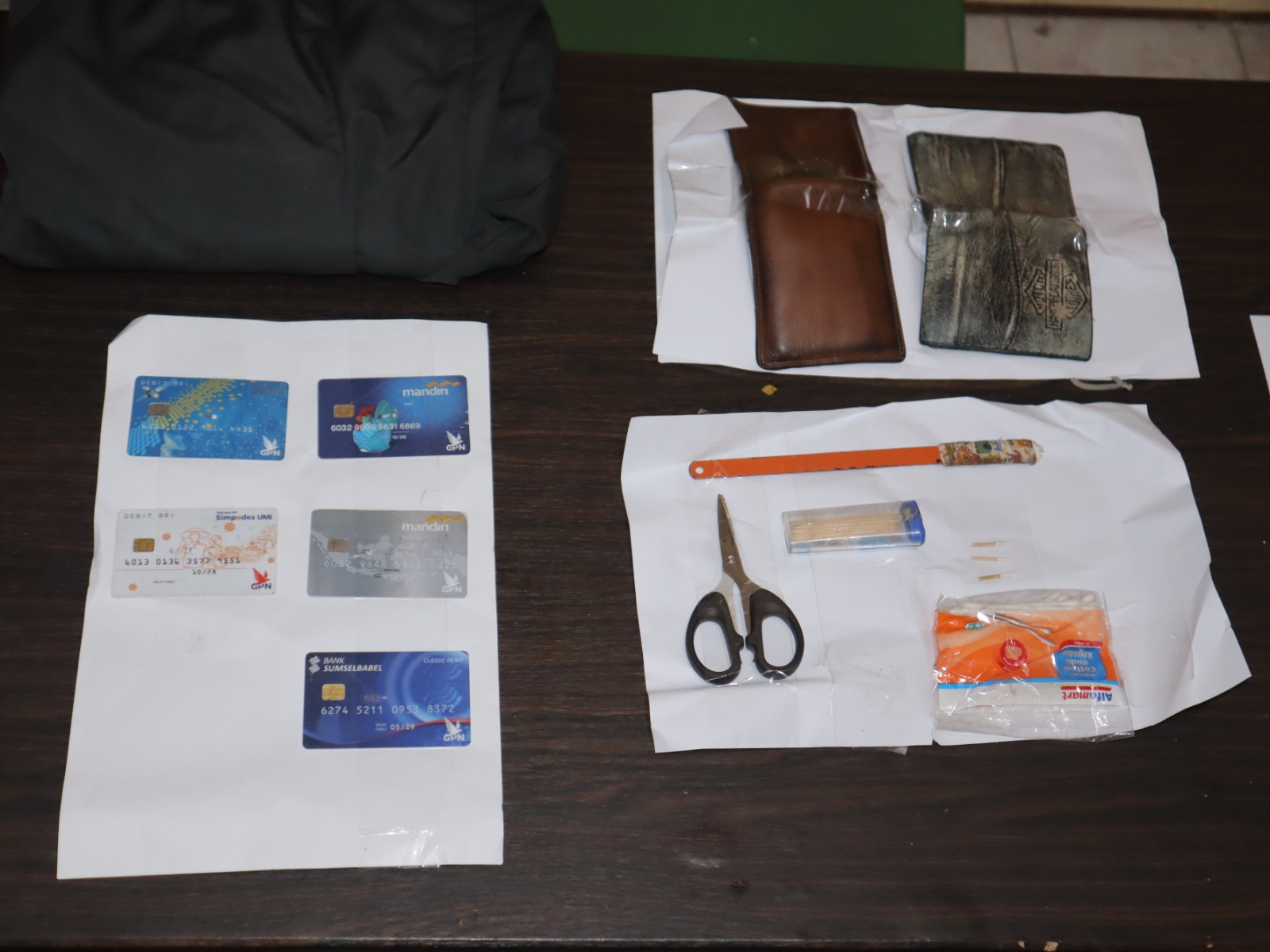 “Dari tangan pelaku, polisi menyita sejumlah barang bukti berupa sejumlah tusuk gigi dan cotton bud yang digunakan untuk mengganjal mesin ATM, gergaji besi dan gunting untuk menarik kartu ATM korban, dompet berisi lima kartu ATM, serta sepeda motor yang digunakan dalam aksi kejahatan.” bebernya