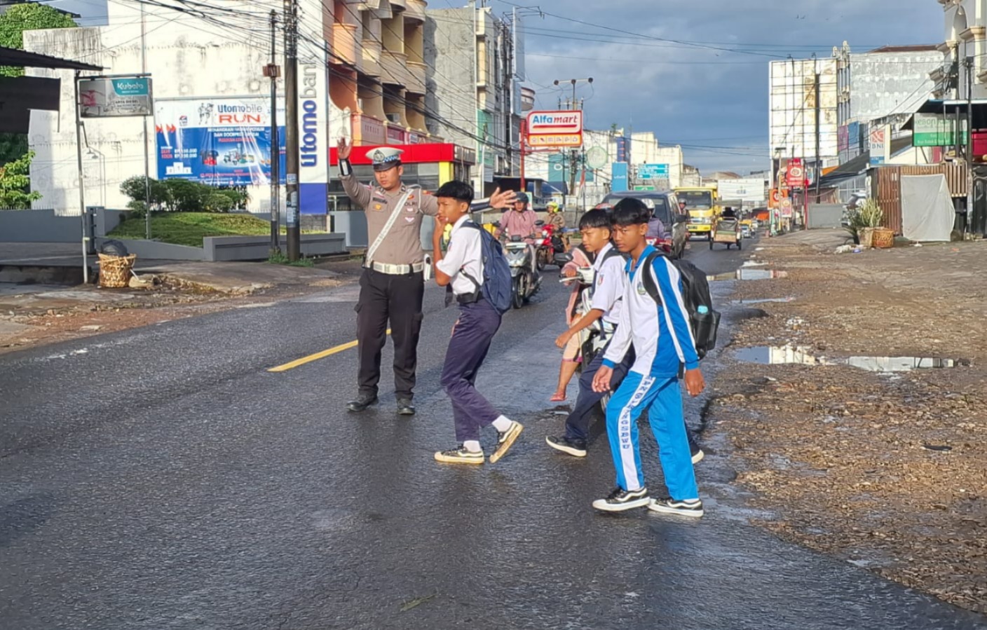 Di lokasi-lokasi tersebut, personel Satlantas tampak aktif membantu menyeberangkan anak-anak sekolah, mengatur kendaraan umum agar tidak menimbulkan kemacetan, serta mengimbau pengendara untuk tetap tertib dan mematuhi rambu lalu lintas.