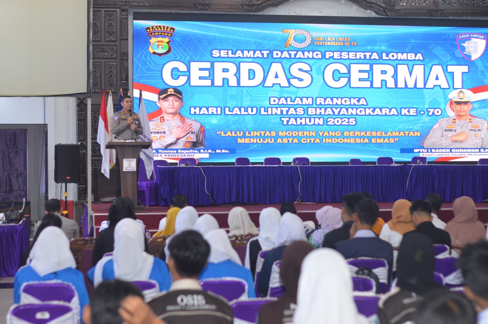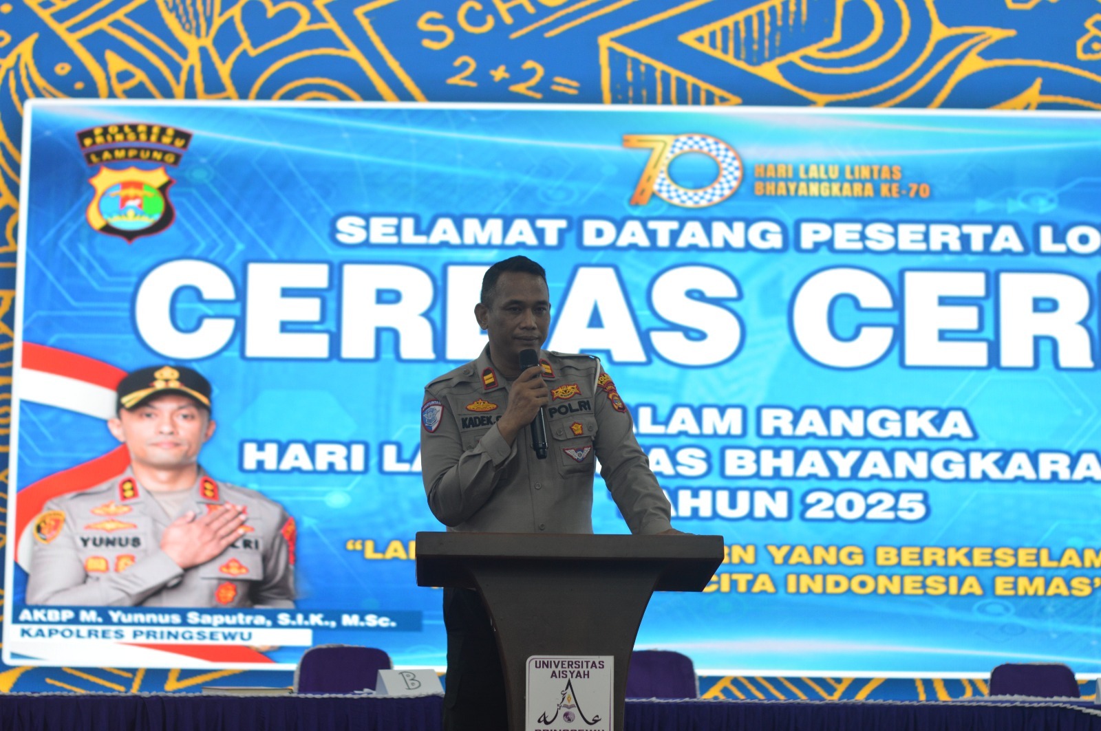 Hotnews.co.id Pringsewu – Dalam rangka memperingati Hari Lalu Lintas Bhayangkara ke-70 tahun 2025, Satuan Lalu Lintas (Satlantas) Polres Pringsewu menggelar Lomba Cerdas Cermat Lalu Lintas tingkat SMA/sederajat se-Kabupaten Pringsewu. Mengusung tema “Tertib Lalu Lintas”, kegiatan berlangsung di Aula Universitas Aisyah Pringsewu (UAP), Rabu (24/9), dan dibuka oleh Kasat Lantas IPTU I Kadek Gunawan mewakili Kapolres Pringsewu, AKBP M. Yunnus Saputra.